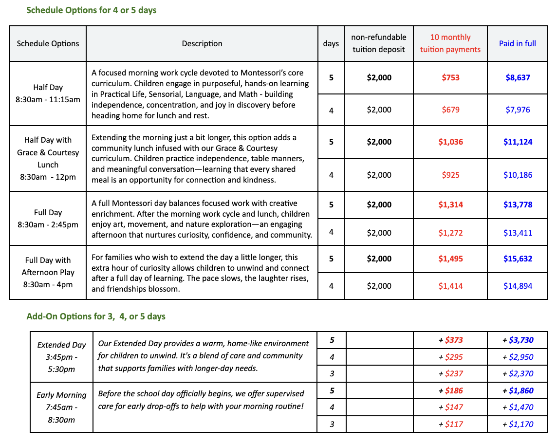 We understand that tuition is an important part of your decision-making journey, so we've presented our tuition structure below. Tuition is an annual fee for the school year and is pro-rated by month (10), with each month having equal value regardless of the school days in the month or the days in the month attended for the children entering or withdrawing during the school year.